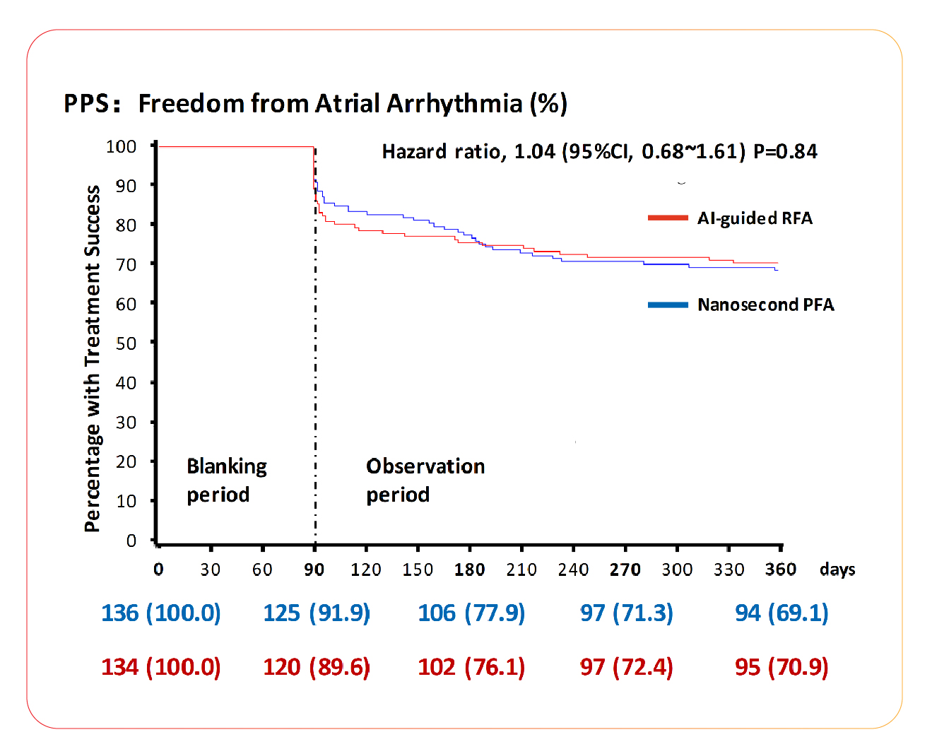 In the Per Protocol Set (PPS), the success rate was 69.1% in the nsPFA group and 70.9% in the AI-guided RFA group (HR 1.04, 95% CI [0.68-1.61]; P=0.84), demonstrating that nanosecond pulsed field ablation (nsPFA) exhibited comparable 12-month long-term efficacy to the well-established RFA.