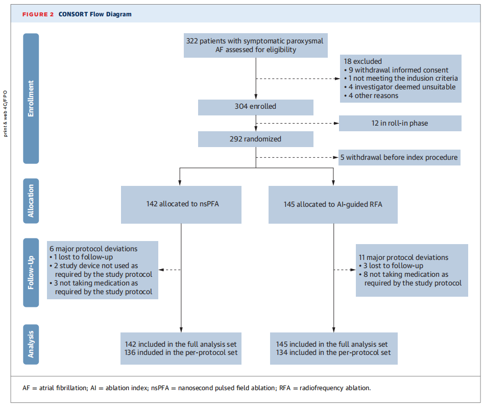 The InsightPFA trial (NCT06014996) was a prospective, multi-center, randomized, noninferiority clinical trial conducted across 13 centers with 27 operators. Eligible patients with symptomatic paroxysmal AF were randomized 1:1 to receive either nsPFA or AI-guided RFA for pulmonary vein isolation (PVI), with a standardized 12-month follow-up.