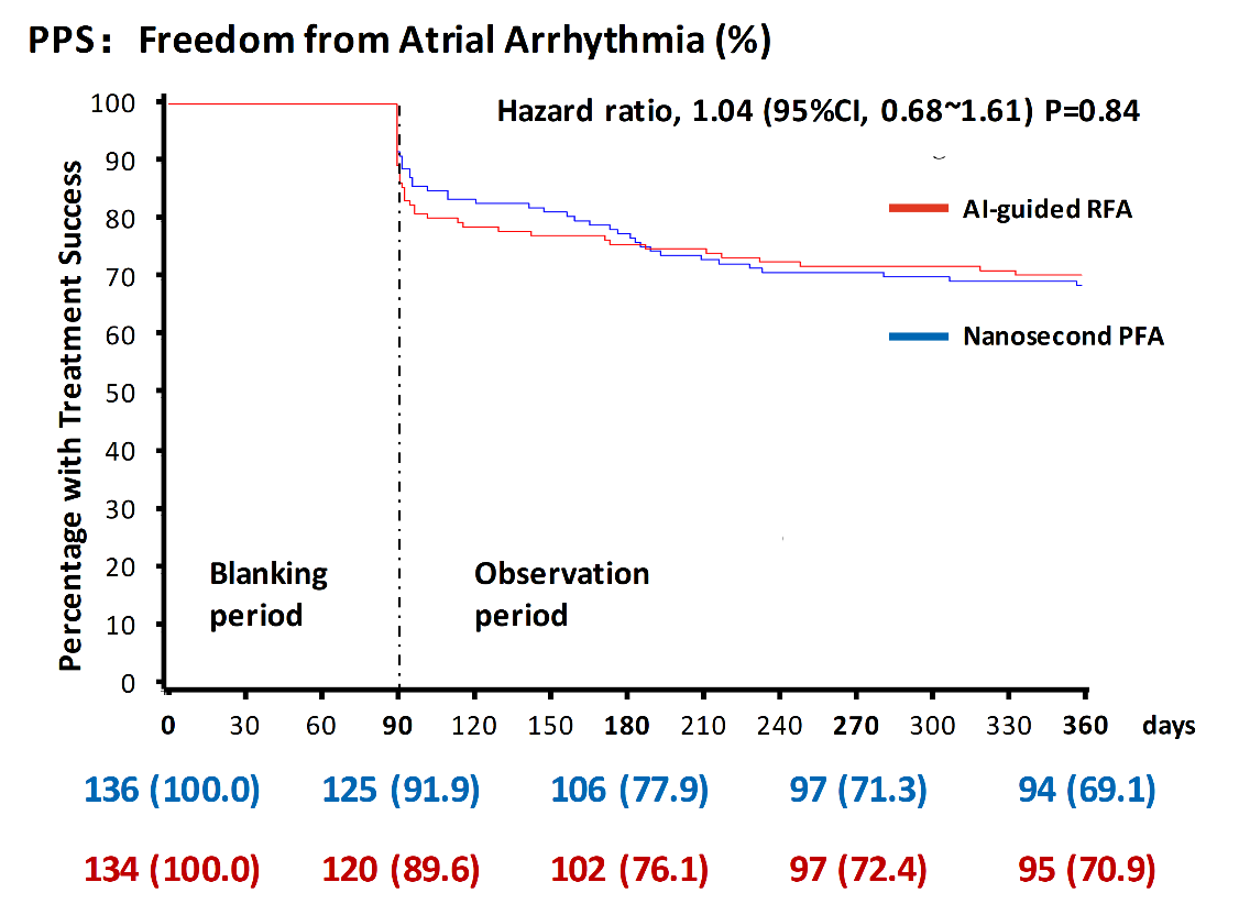 nsPFA demonstrated noninferior efficacy, similar safety, and greater procedural efficiency versus AI-guided RFA, offering a promising new electroporation modality for pulmonary vein isolation. Its consistent feasibility under conscious sedation—with minimal muscle contraction—also suggests workflow and patient-comfort advantages. These findings add meaningful clinical evidence to the global evolution of pulsed field ablation technologies and support nsPFA’s role in next-generation AF ablation strategies.